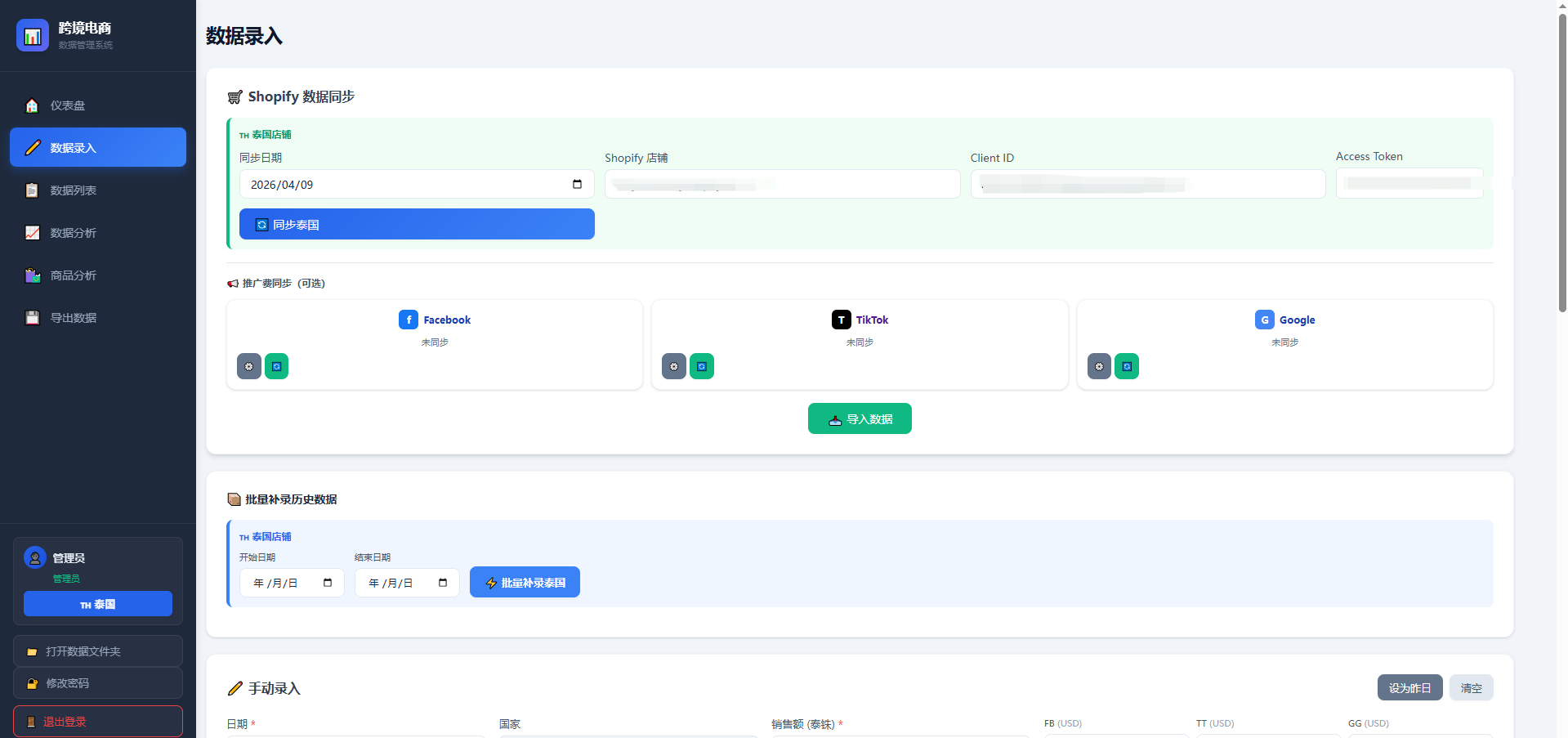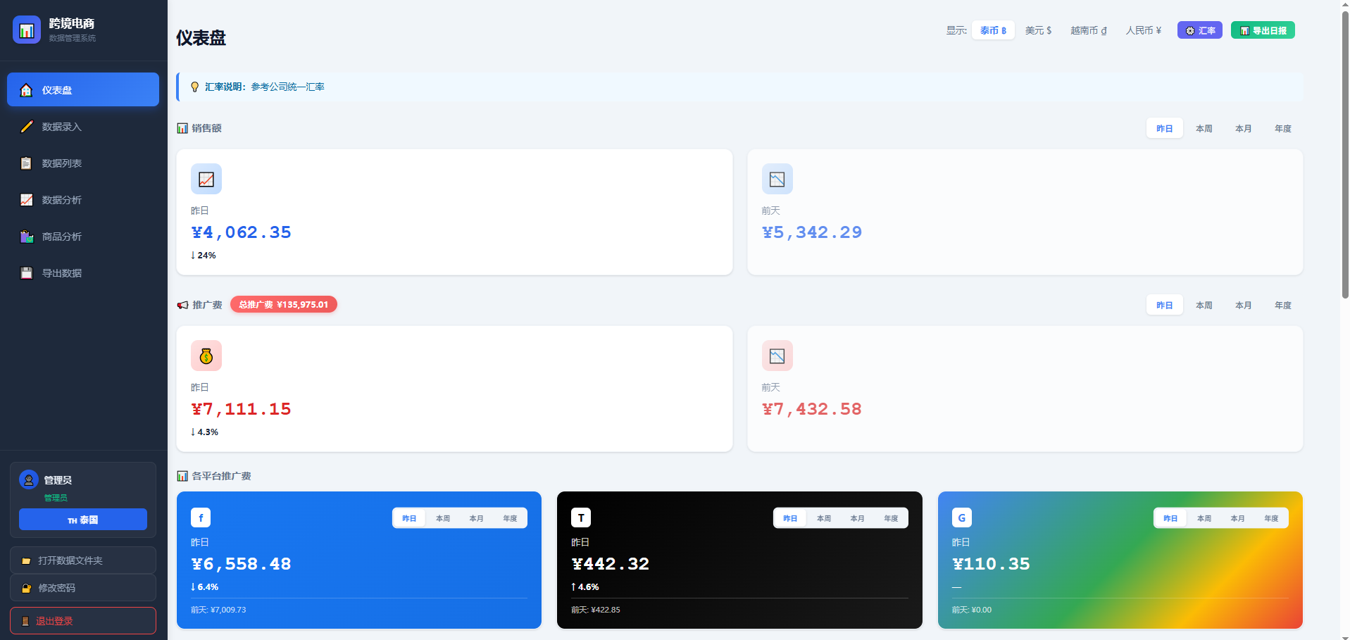 现在这个系统能做的事已经比我最初想的多了很多: -**仪表盘**:昨日/本周/本月/年度销售额,Facebook、TikTok、Google 三个平台的广告费分开显示,每个都有和上一期的对比 -**Shopify 自动同步**:泰国、越南两个店铺都接上了,支持单日同步和批量补录历史数据 -**商品分析**:畅销榜、Top10 柱状图、单品的每日销量趋势,还能看买家下单集中在几点 -**订单目的地统计**:知道订单主要来自哪些省市,方便投放定向 -**多人权限**:管理员可以改数据,给团队里的同事开了只读账号,他们能看数据但不能动 -**日报/周报/月报**:选好日期范围直接生成图片,发群里很方便 -**Excel 导出**:历史数据随时导出 货币显示可以随时切换泰铢、美元、越南盾、人民币,汇率是实时的,也可以自己设定公司内部的固定汇率。
