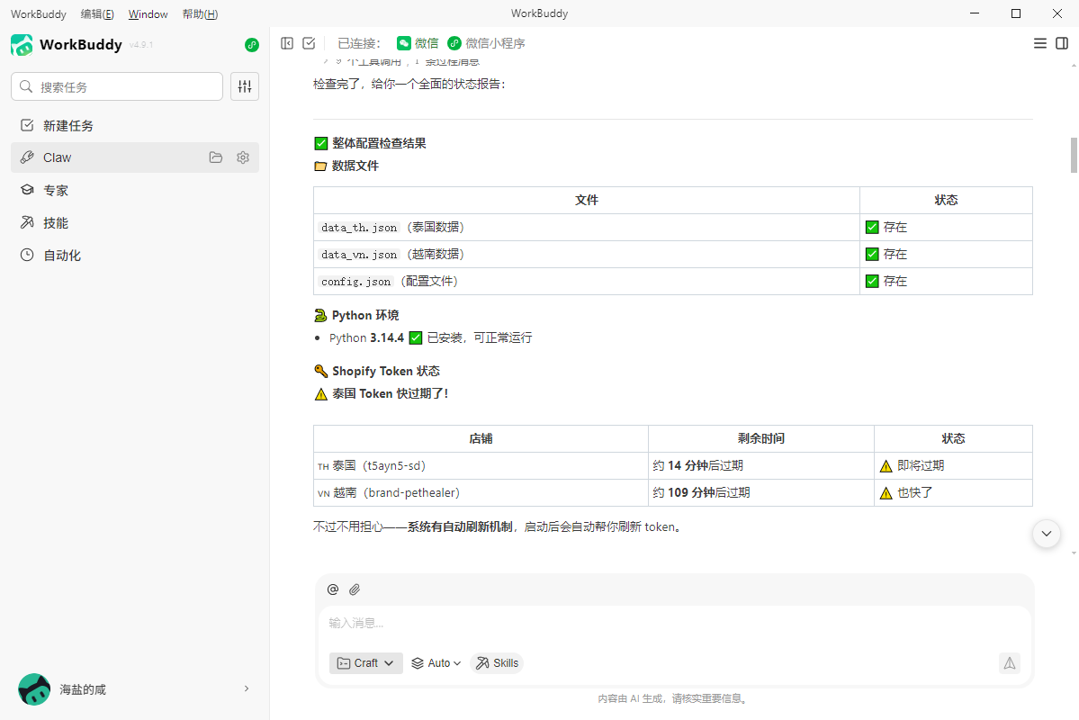 我做跨境电商已经有一段时间了,同时在运营泰国和越南两个独立站,每天要盯着两个 Shopify 后台、三个广告平台,数据全是分散的。每次月底对账,都是把各种表格复制来复制去,很容易出错,也很累。 身边有技术背景的朋友建议我找人开发一个系统,但报价动不动就几万,我觉得不值。 直到我开始用 WorkBuddy(也就是大家说的"虾"),才发现——原来我自己也能做。