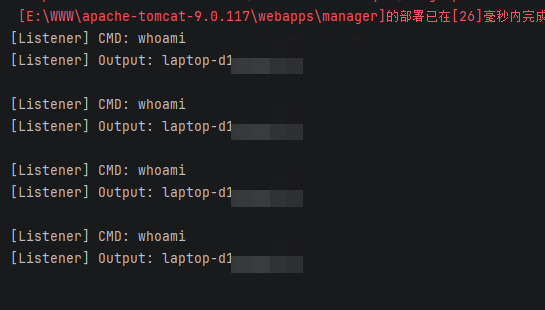 此时再访问 http://localhost:8080/任意路径?cmd=whoami(只要该路径能被注册的监听器监听到就行,即使显示 404 也能被监听到):