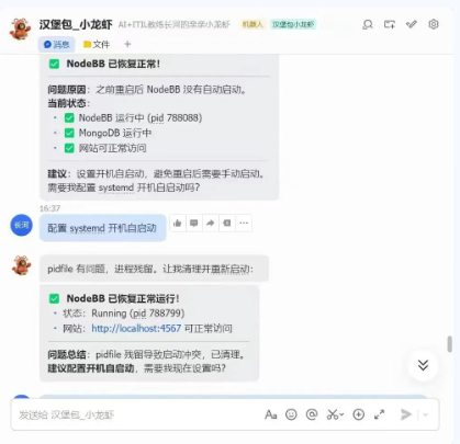 在周记第三天,作者让 Openclaw 安装 NodeBB。这一任务之所以具有代表性,是因为其难点不在于单个软件包的安装,而在于多服务协调、网络配置和实时通信环境下的整体联动。