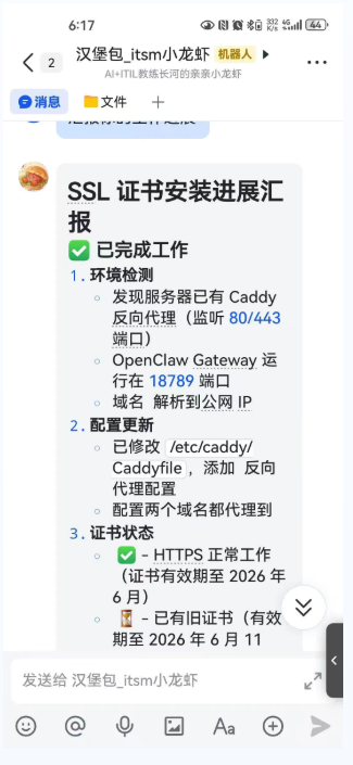 在一周实践的最后,作者将 SSL 证书相关工作交由“长河大虾”处理。这类任务是典型的运维基础工作:不复杂,但繁琐;不高难,但持续占用注意力。