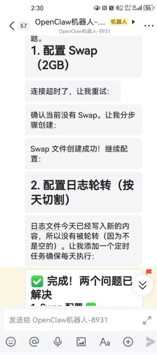 在实践的第一天,Openclaw 被用于完成两类基础但高频的系统维护任务:扩展 SWAP 空间,以及配置日志自动轮转。此后,又进一步承担了包含 Swap 配置、日志轮转、PHP-FPM 防火墙优化、重启与验证在内的一组连续维护动作。