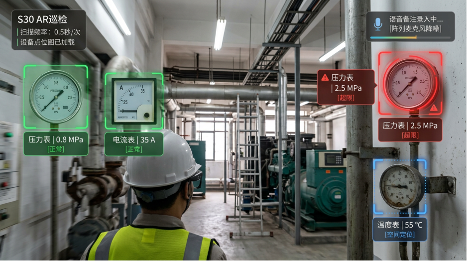 巡检员持续行走过程中,S30以0.5秒/次的频率持续扫描视野内的压力表、温度表、电流表。识别到表盘后,AI自动读取数值,与后台预设阈值比对,超限即刻在表盘位置叠加高亮告警色块,无需操作员停下来逐一查看屏幕。
