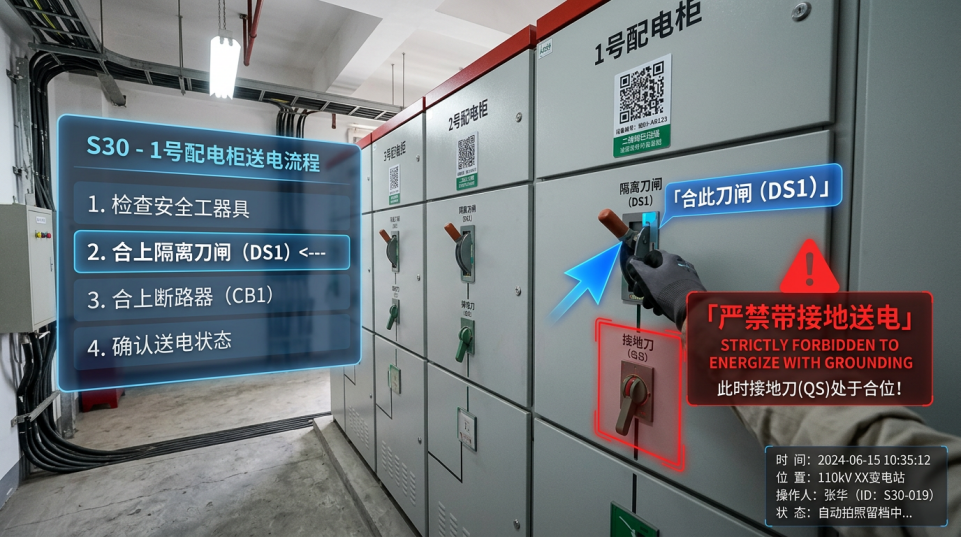 当摄像头识别到接地刀处于合位时,视野中对应区域立即叠加警示框「严禁带接地送电」,警示触发不依赖人工判断,属于AI主动干预。每步操作自动拍照留档,生成含时间戳、GPS坐标、操作人信息的数字台账,替代纸质操作票。