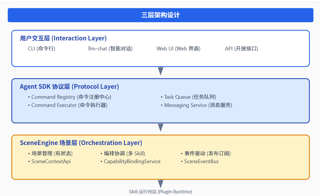 CLI 层负责用户交互、权限校验、命令转换和结果格式化。Agent SDK 层提供协议封装、任务调度、状态管理和多活支持。SceneEngine 层提供场景编排、状态维护、事件驱动和权限控制。