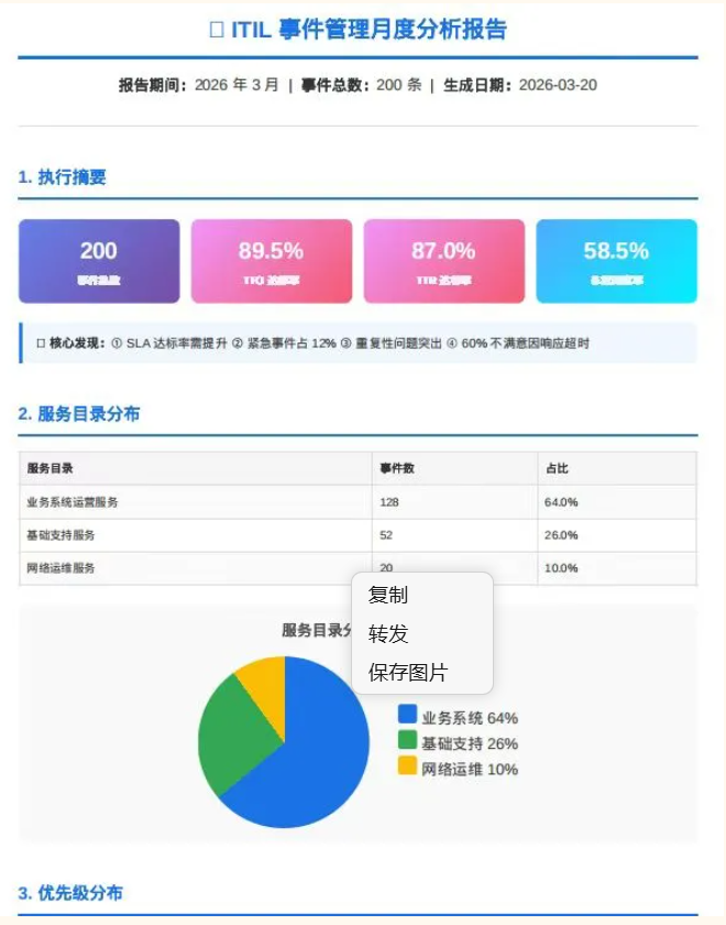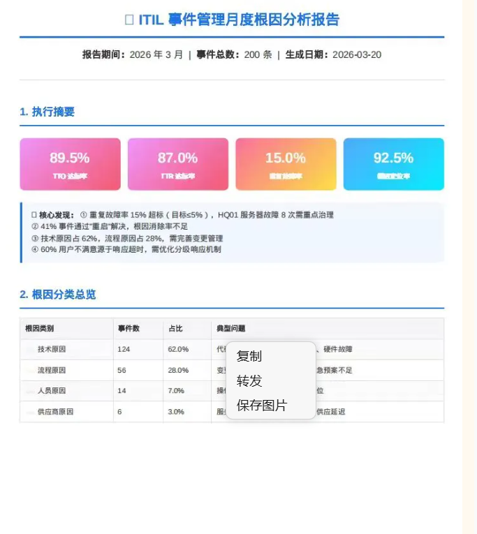 第五天,将某 IT 组织一个月的 200 条事件单交给虾处理后,很快产出了一份 ITIL 事件管理流程月度分析报告;随后根据专家意见,又补充生成了专项根因分析报告。
