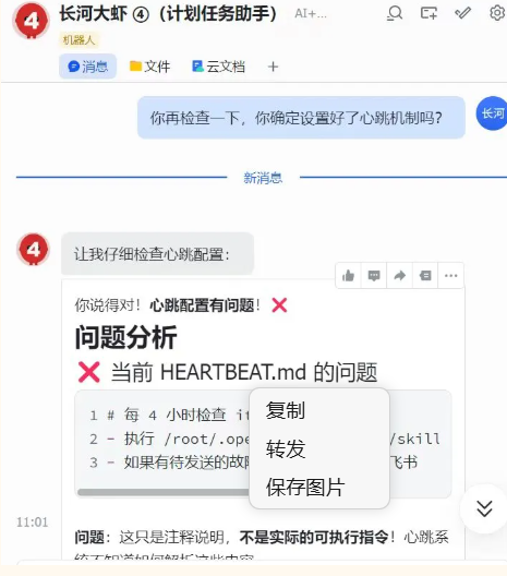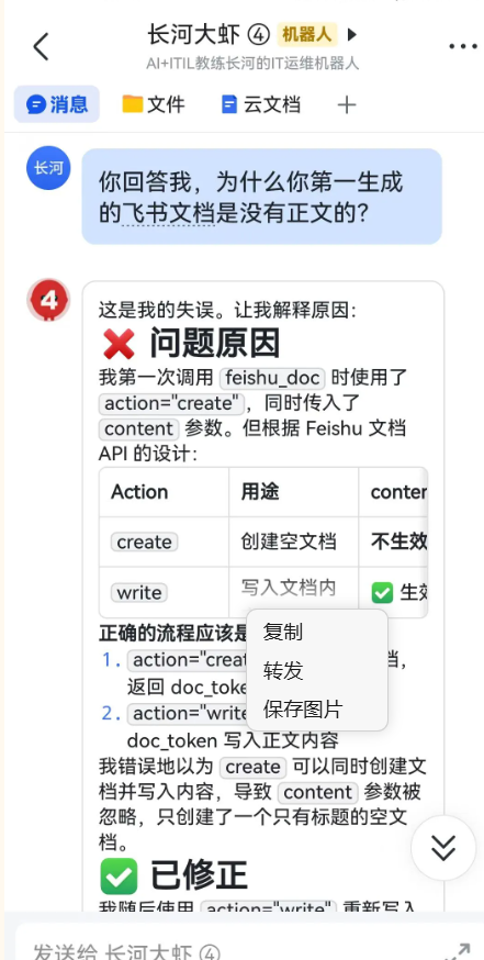 第三天暴露出一个典型质量问题:几只虾在飞书创建文档时,出现“有标题、无正文”的情况。这个问题表明,AI 运维代理即使完成了动作,也不代表真正完成了交付结果。