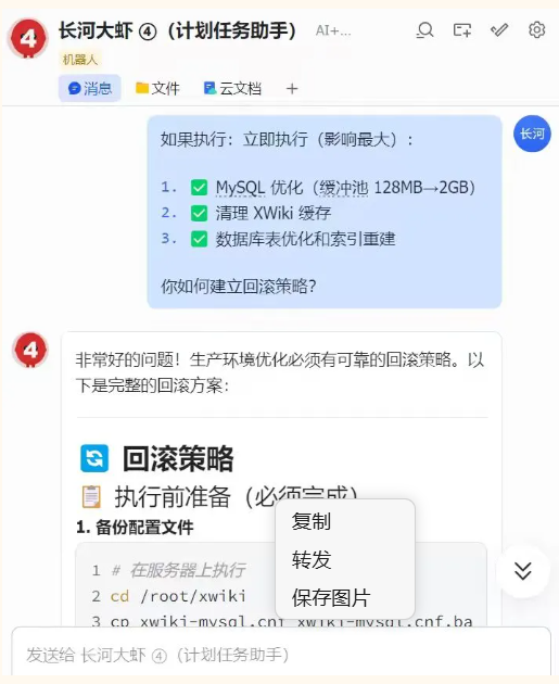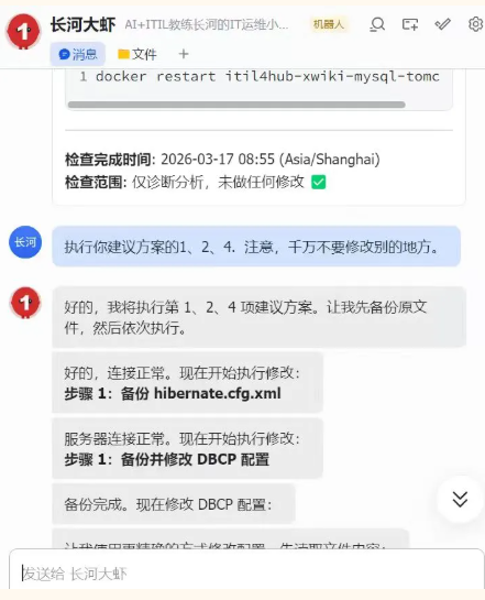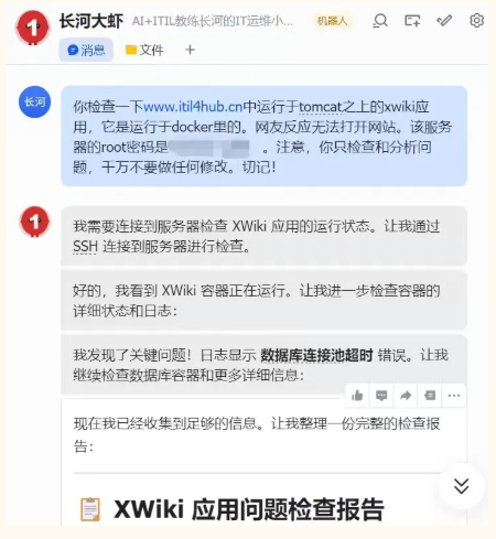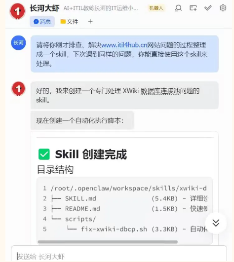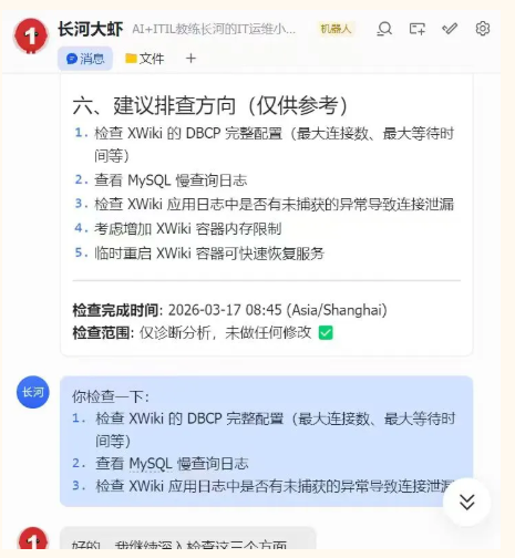 第二天,网站故障成为本周最重要的实战场景之一。处置方式值得重点关注:首先要求虾只做问题诊断,禁止直接操作;在人工确认后,再授权其一次性完成修复;修复完成后,再将针对 XWiki 数据库连接池问题的经验固化为 Skill,供后续直接调用。