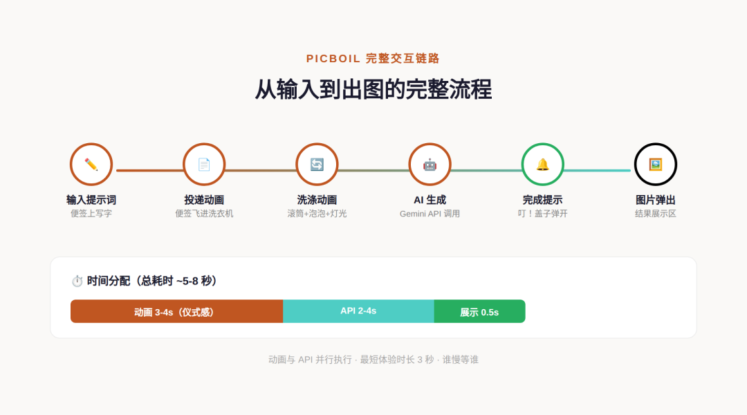 这就是 Picboil 和其他 AI 图片工具最大的区别:别人是"输入→等待加载→出图",我们是"输入→一场小演出→出图"。等待本身也可以是产品的一部分。