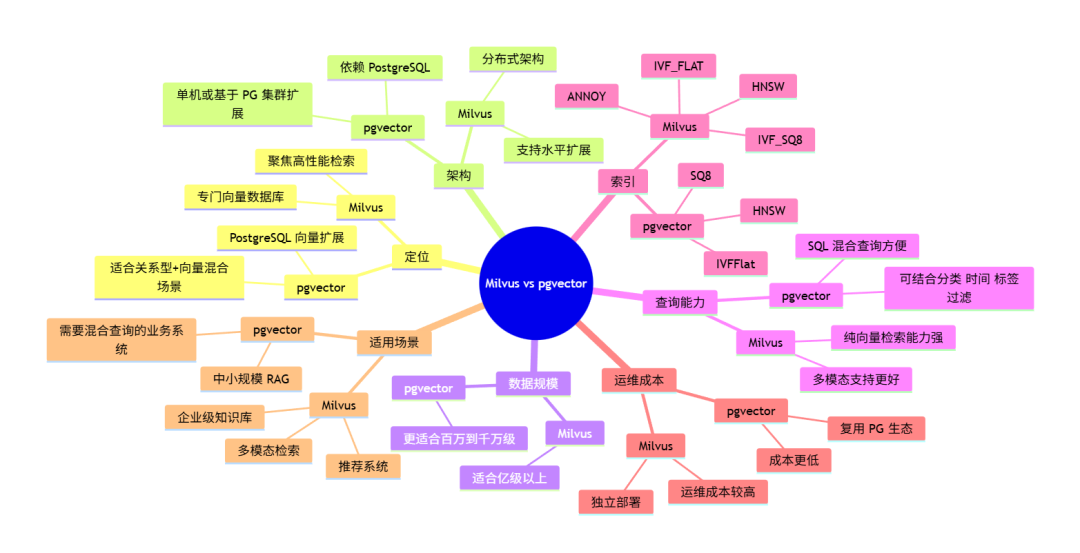 Milvus 强在专业能力、扩展性和大规模检索; pgvector 强在 SQL 生态、混合查询和工程落地效率。
