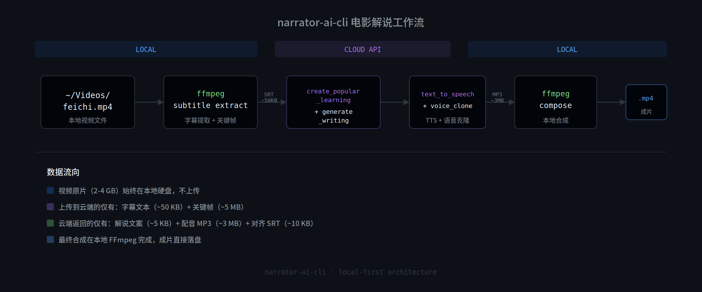 两层之间的数据穿越点严格控制在轻量载荷:字幕文本(几十 KB 的 SRT 文件)、关键帧序列(几 MB 的 JPEG 图像)、生成好的文案(几 KB 文本)、生成好的配音片段(几 MB MP3)、以及剪辑指令的 JSON。真正的大块头——那些几百 MB 到几个 GB 的视频源文件——从头到尾待在你的本地硬盘上,不上传、不拷贝、不缓存到云端。
