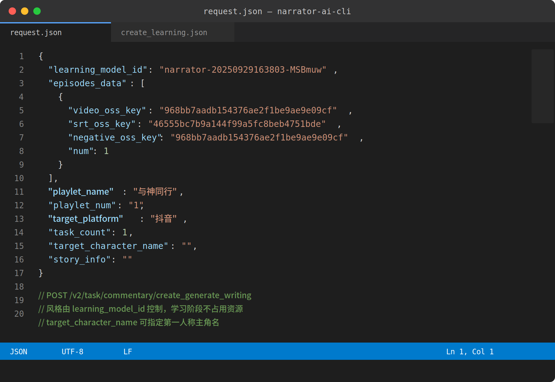 接口是 POST /v2/task/commentary/create_popular_learning。CLI 先从你本地的一段参考视频里抽出字幕 SRT,把这段字幕文本提交给接口,让后端学习这段参考文案的句式节奏、钩子结构、情绪节拍。学完返回一个 learning_model_id,形如 narrator-20250929163803-MSBmuw。请求体是这样的: