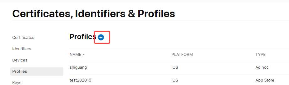 在苹果开发者中心打开profiles这个菜单,点击蓝色小加号,就可以创建profile文件了。