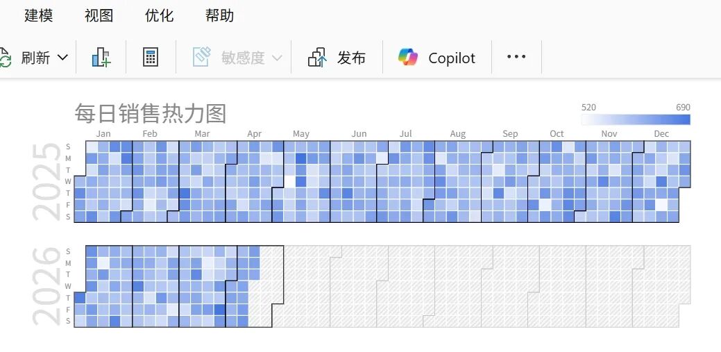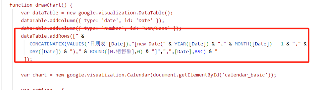 再举个日历的例子,同样复制代码到Power BI度量值,代码中的日期和数据需要动态变化: