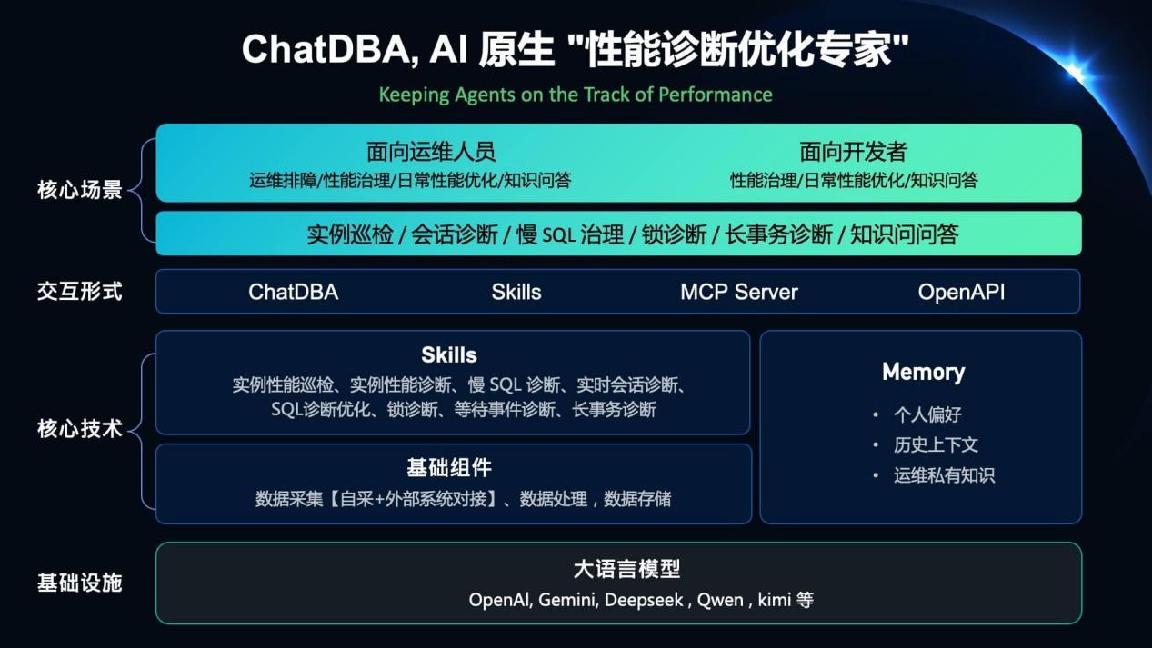 第三,ChatDBA 作为 AI 原生“性能诊断优化专家”正式亮相,是智能运维能力的正式落地。面向慢 SQL 治理、锁诊断、长事务分析、会话诊断、实例巡检等典型运维场景,尝试把资深 DBA 的经验转化为可复用、可调用、可协同的智能能力。这意味着,AI 在 NineData 体系中不再只是辅助工具,而开始成为企业数据管理中的“执行者”和“协作者”。