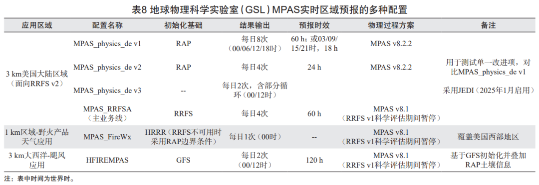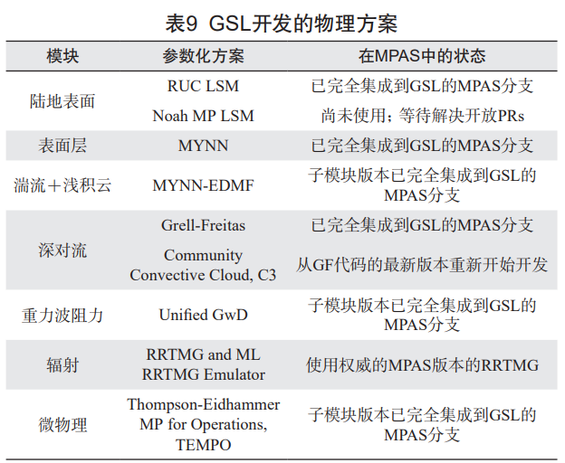 由 NOAA 地球物理科学实验室(GSL)主导的 RRFS v2 区域预报包括多种实时试验配置,如 3 km CONUS(美国大陆)、1 km 野火产品天气应用和 3 km 飓风应用(表 8)。该类配置为 RRFS v2 的开发提供了丰富的测试场景。GSL 开发的物理方案已部分集成到 MPAS 中,包括陆地表面模式、湍流和浅积云参数化、深对流参数化等(表 9)。为进一步提升 RRFS v2 的预报能力,未来将持续优化物理预报方案。