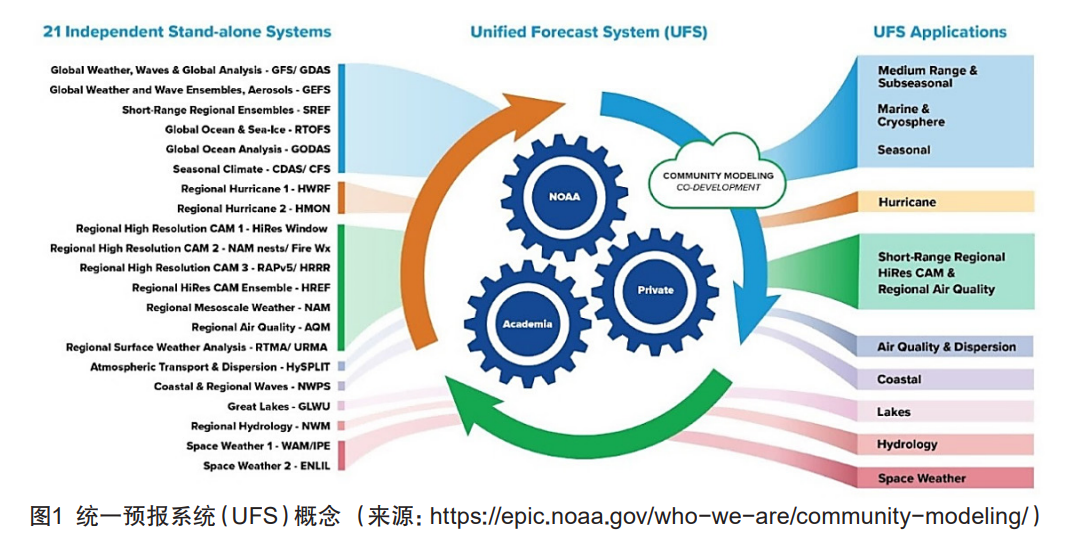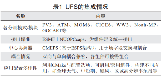 UFS 的概念最早于 2014 年在美国出现。为整合和简化原本分散的多套不同框架的数值预报模式,NOAA 牵头开发了 UFS 系统。UFS 是一个基于社区开发的、耦合的一体化数值预报系统,能够支撑从局地到全球、从小时到季尺度的预报预测。UFS 采用 FV3 动力核心,充分利用模块化组件与标准化耦合平台(表 1),将其 21 个现有业务系统整合为八大核心应用(图 1),这些应用共享统一的建模框架和核心物理过程。尽管 UFS 的统一架构与开放共建的模式显示出诸多优势,但在实践中,要真正实现 “统一” 的目标仍面临组织的复杂性、标准化验证流程与稳定性要求,以及高性能计算的大规模投入与高运行成本等难题。