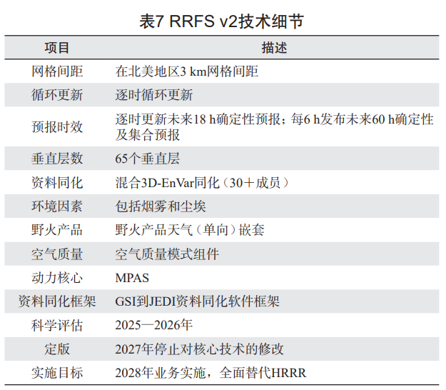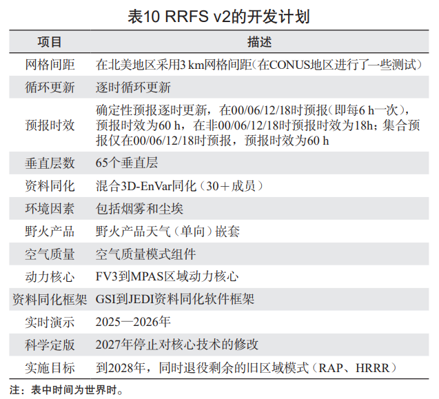 未来,RRFS v2 将继续采用 3 km 网格间距,实现逐时循环更新,并计划在 2027 年停止对核心技术的修改,于 2028 年开展业务实施。届时,RRFS v2 将全面替代现有的快速更新预报系统 HRRR。RRFS v2 的科学评估在 2025—2026 年进行,重点评估其在对流预报、资料同化和多尺度耦合方面的性能。其评估结果将为 2028 年的业务化实施提供科学依据(表 10)。