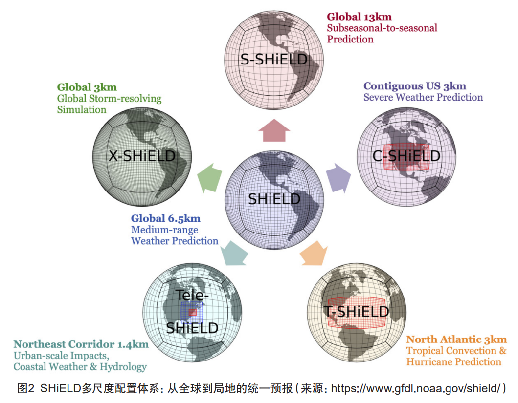 SHiELD 是基于 UFS 框架和 FV3 动力核心开发的高分辨率大气模式原型,支持 “单一代码、单一可执行文件、单一工作流程”,可配置运行于全球(如 6.5 km 中期预报)、区域(如 3 km 对流尺度、1 km 城市网格)等多种尺度。SHiELD 不仅支持科研与试验环境中的高分辨率试验,也为后续研发成果向 UFS 或其他 FV3 系统的无缝转化提供了平台(图 2),然而,其运行对超级计算资源的依赖极高,目前主要处于科研与试验阶段。