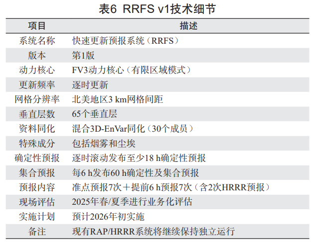 RRFS 是 NOAA 在 UFS 框架下研发的新一代区域天气预报模式,自 2016 年起研发,旨在通过改进资料同化系统、物理方案和工作流程,实现更精细、更准确的对流天气预报。RRFS 第 1 版(v1)采用了 FV3 动力核心,水平分辨率为 3 km,65 个垂直层,且采用混合三维集合变分同化(3D-EnVar)技术,可实现逐时更新且提供未来至少 18 h 的确定性预报(表 6)。