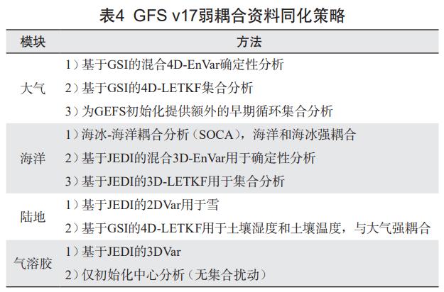 JEDI 平台采用面向对象设计,具有模式无关性、可移植性强等显著优势,可实现在模式本身网格上直接应用多种同化算法(如 Var、EnKF、混合方法),省去额外插值步骤,有效提升预报系统的准确度和计算效率。在 GFS v17 多圈层弱耦合系统(WCAF)中,JEDI 平台被用于优化不同模块的资料同化策略(表 4):大气资料同化方案继续采用基于格点统计插值系统(Gridpoint Statistical Interpolation,GSI)的混合 4D-EnVar 确定性分析,同时引入基于 GSI 的 4D-LETKF 集成分析,并计划集成多尺度同化算法,以提升对复杂天气事件的捕捉能力;针对海洋与海冰模块,将通过 JEDI 的 SOCA 接口,将 MOM6 与 CICE6 纳入强耦合同化,采用集合卡尔曼滤波(Ensemble Kalman Filter,EnKF)分析技术(如 3D-LETKF/3D-EnVar)方法,实现海、气圈层的协同分析;陆地以及气溶胶模块也采用 EnKF 分析技术,其中将气溶胶观测纳入耦合系统中是 GFS v16 所不具备的。