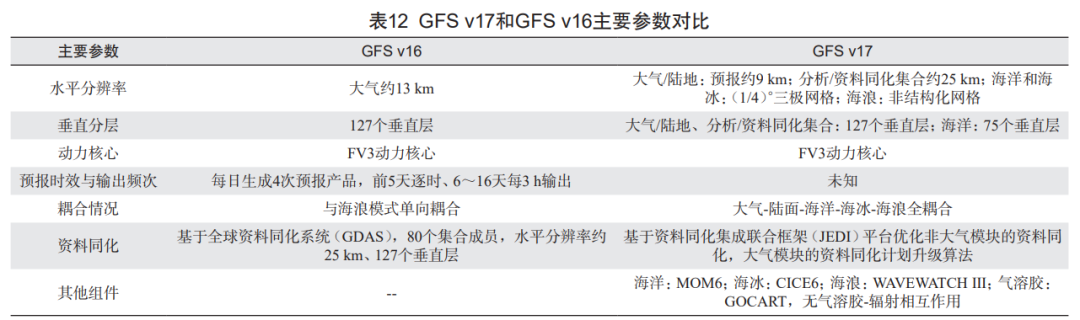鉴于 GFS v16 在强对流天气预报中存在 CAPE 低估及海浪预报存在系统偏差等问题,EMC 启动了 GFS v17 业务化升级研发工作(表 12)。全球模式 GFS v17 大气水平分辨率将从 13 km 提升至 9 km,并构建大气陆面 - 海洋 - 海冰 - 海浪全耦合模式,通过 JEDI 平台优化资料同化策略。这些改进显著提升了全球中期天气预报的精度,尤其是在极端天气事件的预报能力上。对 GFS v17 高分辨率试验版本(如 HR1、HR2、HR3A、HR3B、HR4 等)评估发现,GFS v17 的热带气旋强度和降水预报性能有显著提升,验证了高分辨率模式对提升极端天气事件预报能力的有效性。GFS v17 与全球集合预报系统 GEFS v13 在模式物理方案、计算基础设施、初始化等方面将保持一致,计划于 2026 年与 GEFS v13 协同运行,持续优化模式性能。