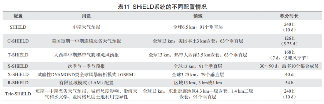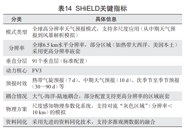SHiELD 系统则通过 6.5 km 高分辨率模拟,有效弥合了全球中期天气预报与全球风暴解析模拟的差距。该系统不仅在热带气旋强度、强降水等高影响天气的预报能力上取得了显著改进,还在全球温度、风、云和降水的预测精度上表现出色。通过多种配置的应用场景(如中期天气预报、热带气旋和飓风预报、次季节至季节预报等),SHiELD 系统展示了其在跨多种时间和空间尺度的统一预报系统中的强大功能(表 14)。此外,SHiELD 系统在物理参数化方案和资料同化技术上的持续优化,为其在未来天气和气候预测领域的应用提供了更广阔的发展空间。