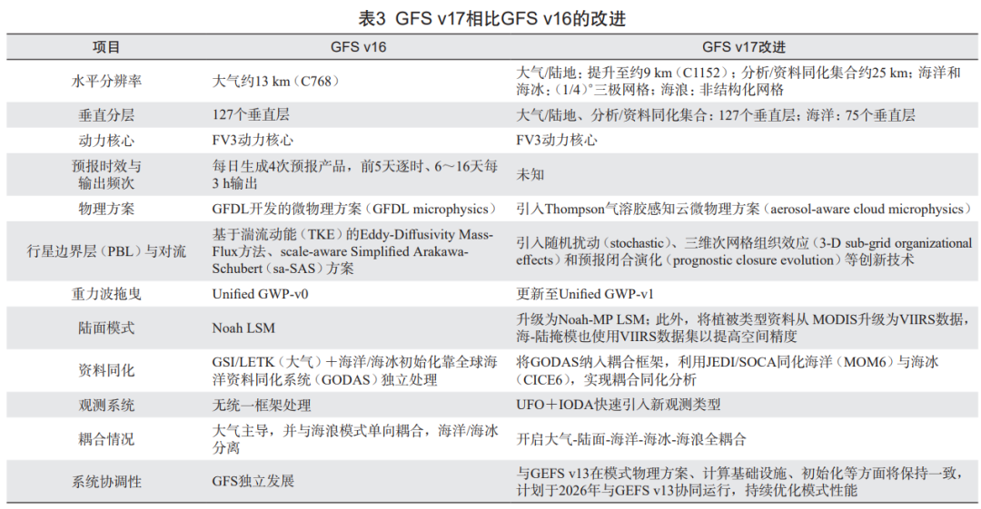 GFS v17 在系统架构层面进行了精心设计,通过将大气模式分辨率提升至 9 km、改进大气物理参数化方案、引入资料同化集成联合框架(Joint Effort for Data assimilation Integration,JEDI)平台支持等解决 GFS v16 的局限(表 2、表 3)。