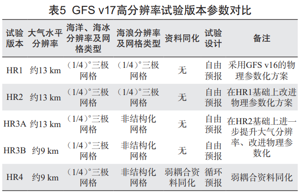 自 2019 年起,由 NOAA/NCEP/EMC 主导,并联合 UFS 社区共同推进,开展了一系列高分辨率(HighResolution,HR)数值天气预报系统试验版本的研发工作。该系列试验版本(HR1 至 HR4)依次演进,各版本研发周期存在并行交叉。研发核心旨在通过构建更高精度的数值动力框架,并持续迭代物理参数化方案(表 5),以提升对对流有效位能(CAPE)、云量和短波辐射通量等关键气象要素的模拟能力。高分辨率的模拟研究为 GFS v17 的最终业务化应用提供了科学支撑与技术验证。