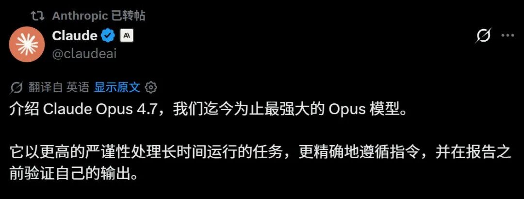 就在昨晚,当科技圈还在讨论算力缺口时,Anthropic 毫无预热地发布了其最新基座模型:Claude Opus 4.7。