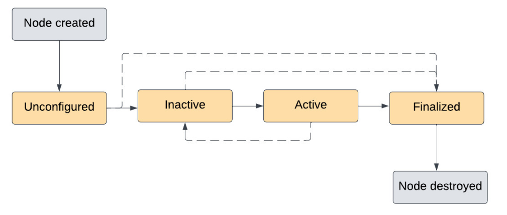 在这种模型下,一个节点不再是启动就开始工作,而是需要经历多个阶段,例如 Unconfigured、Inactive、Active 和 Finalized。每一个阶段都有明确的语义:在 configure 阶段完成资源初始化,在 inactive 状态保持就绪但不输出数据,在 activate 后才真正参与系统运行。