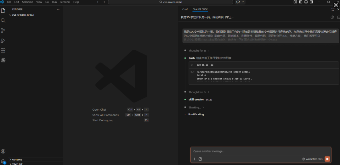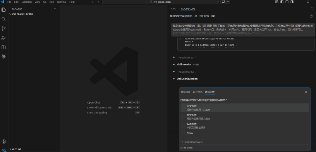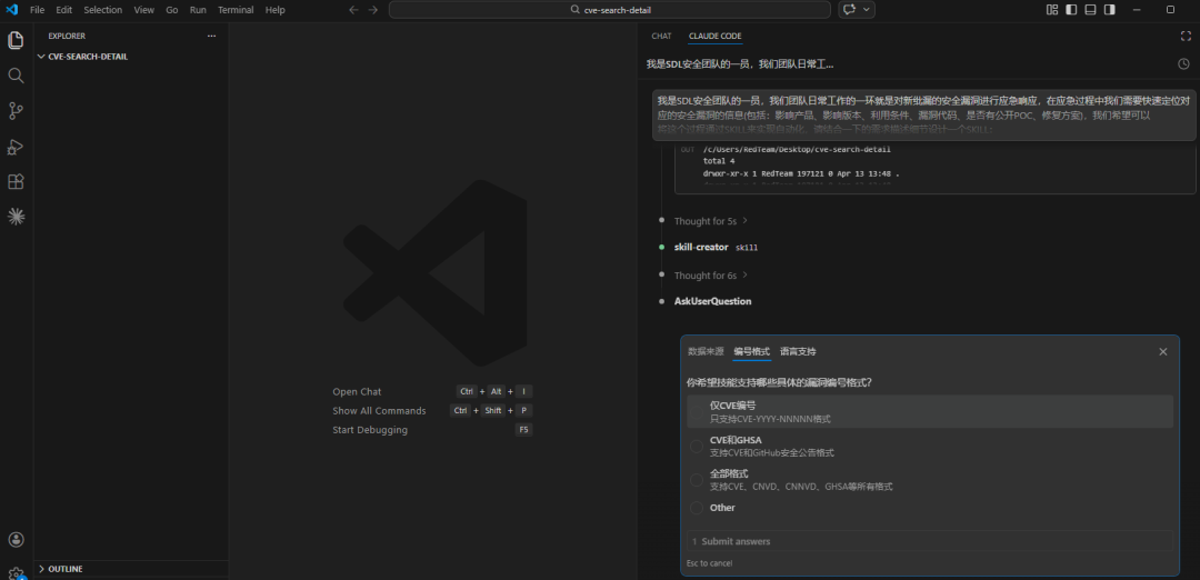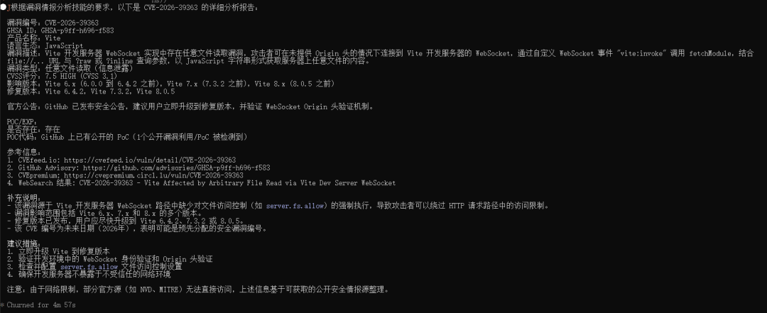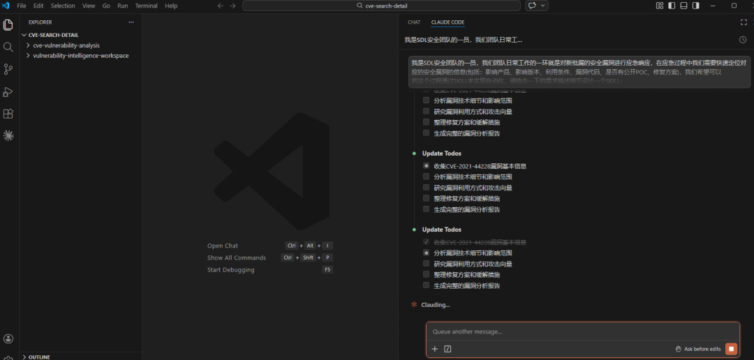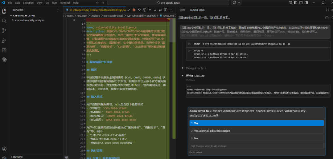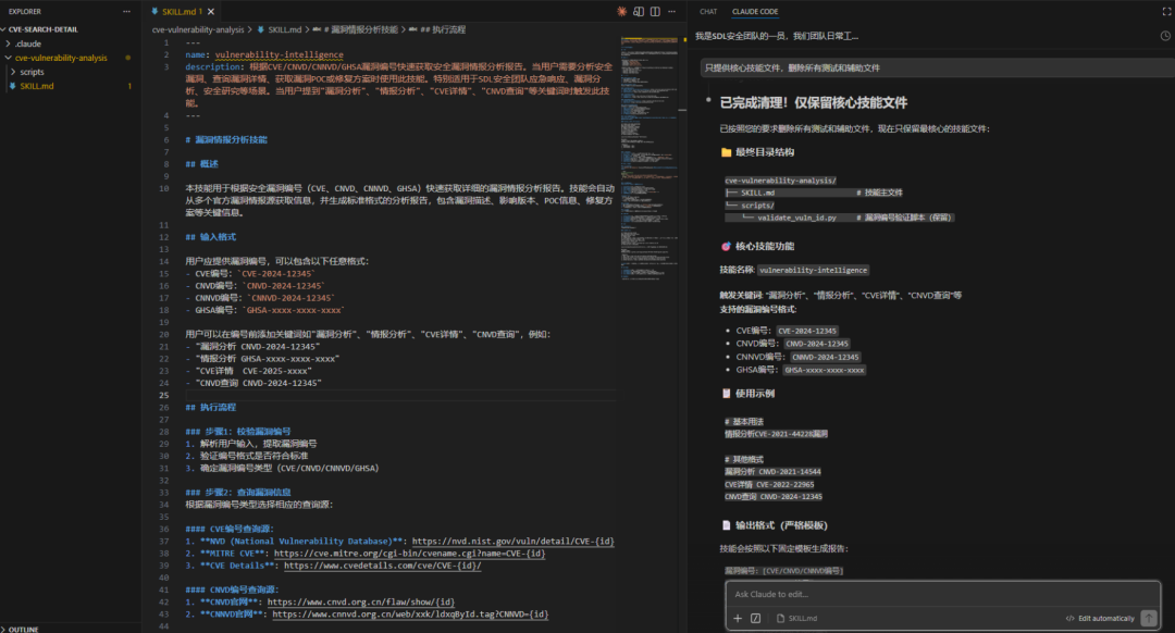main()随后我们将生成的SKILL放到.claude中并使用Claude来进行漏洞情报分析