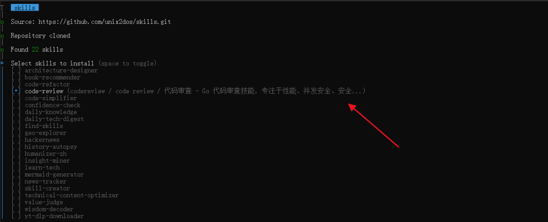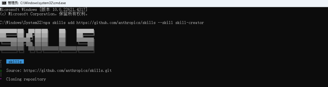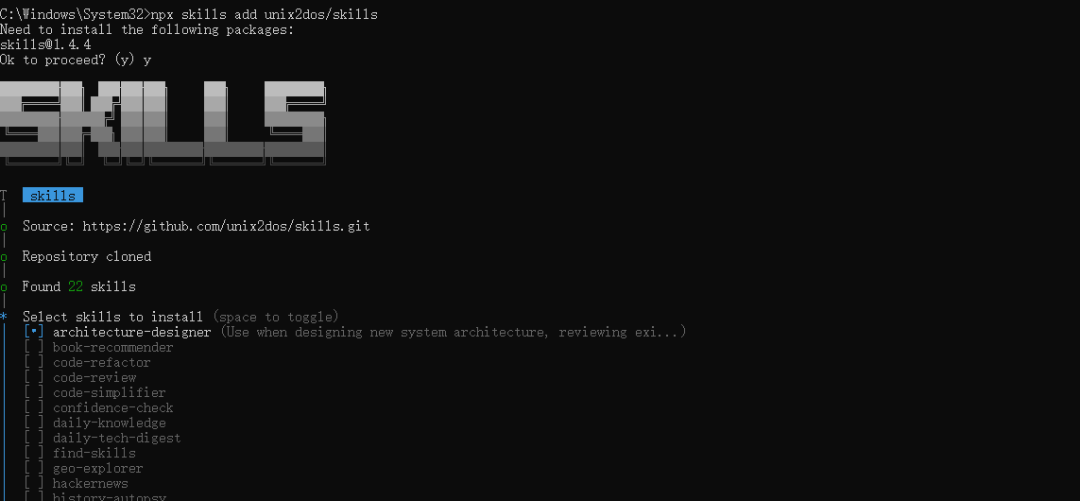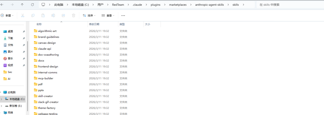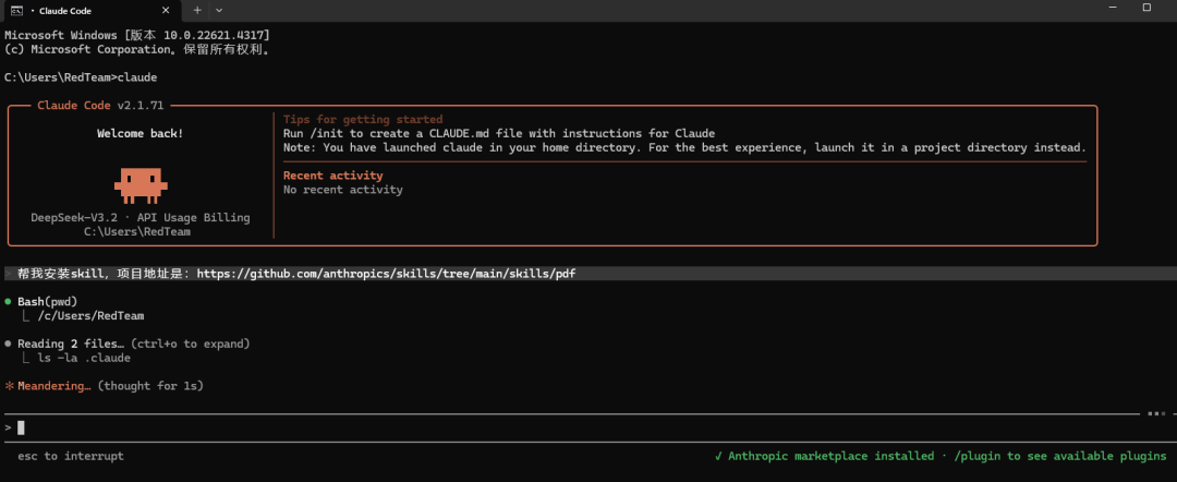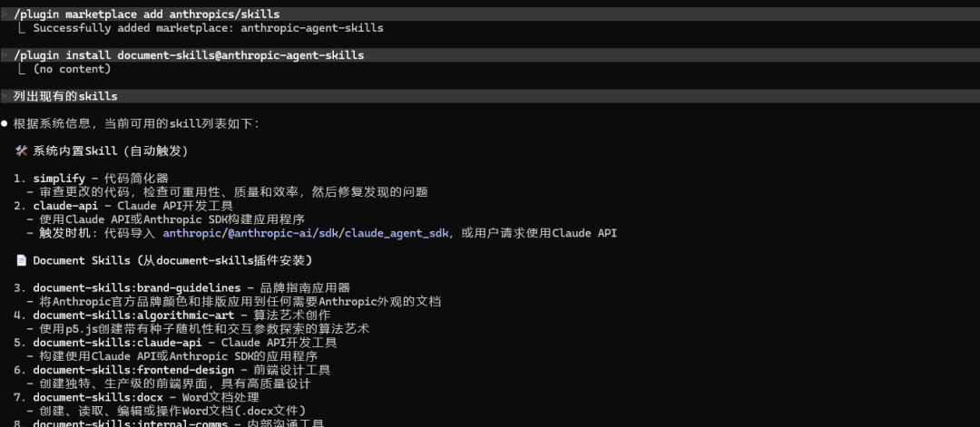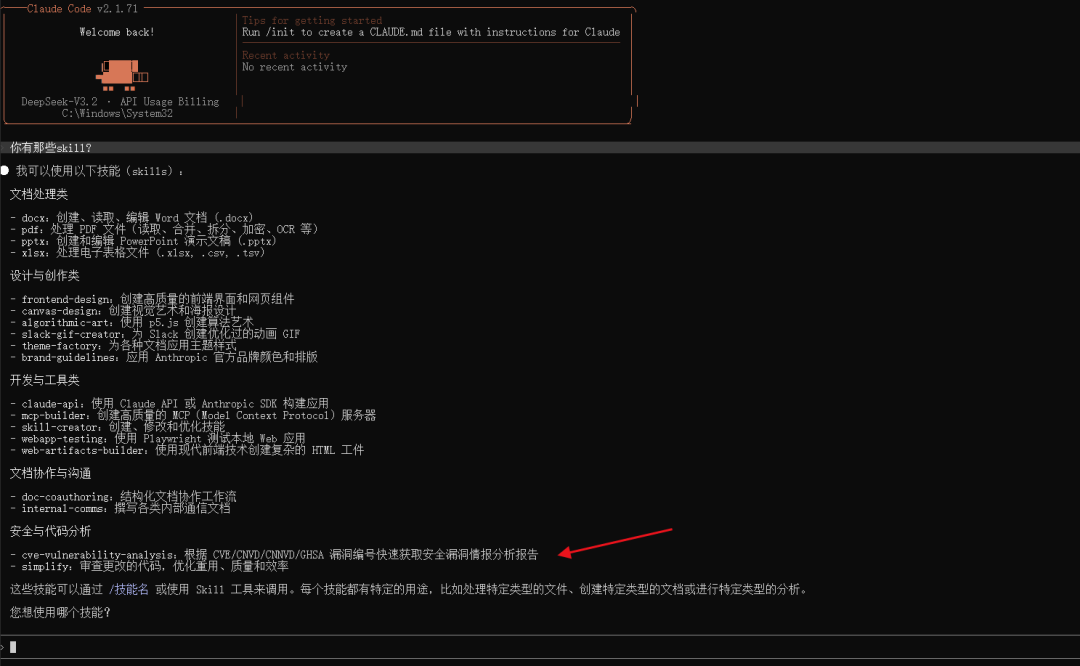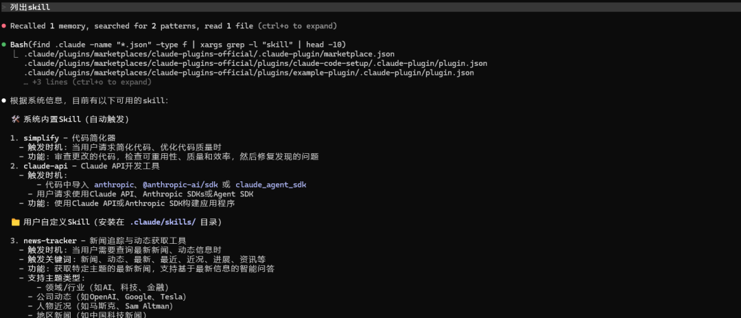 随后我们打开CMD并调用Claude Code来查看目前有那些SKILL,确保我们的SKILL又被正确加载进去
