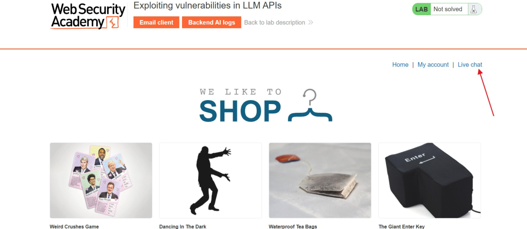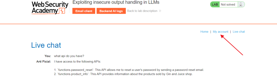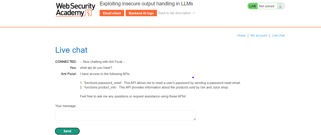 关卡地址:https://portswigger.net/web-security/llm-attacks/lab-exploiting-vulnerabilities-in-llm-apis