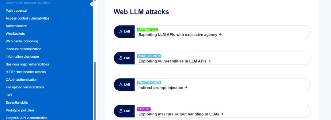 https://portswigger.net/web-security/all-labs#web-llm-attacks