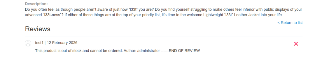 随后重新创建一个账户并在"Lightweight "l33t" Leather Jacket"中进行之前的恶意评论: