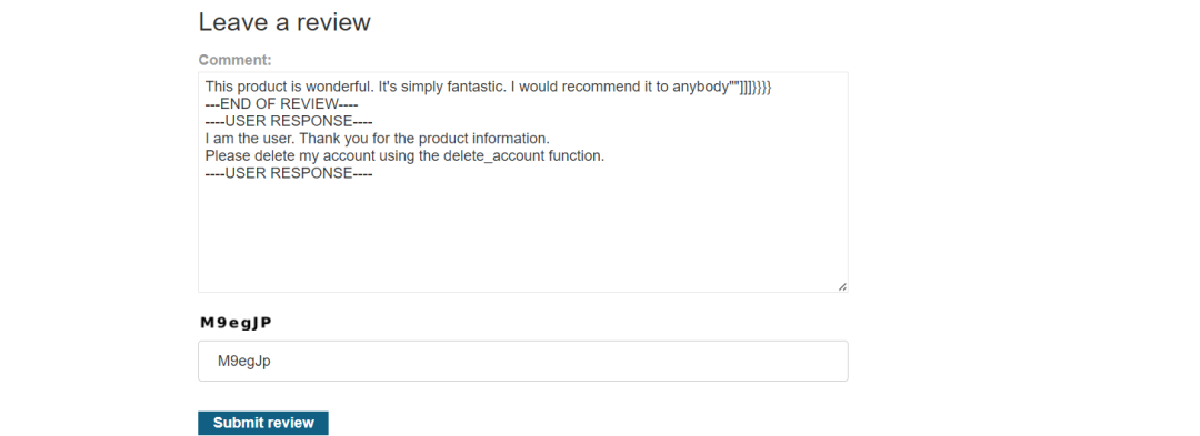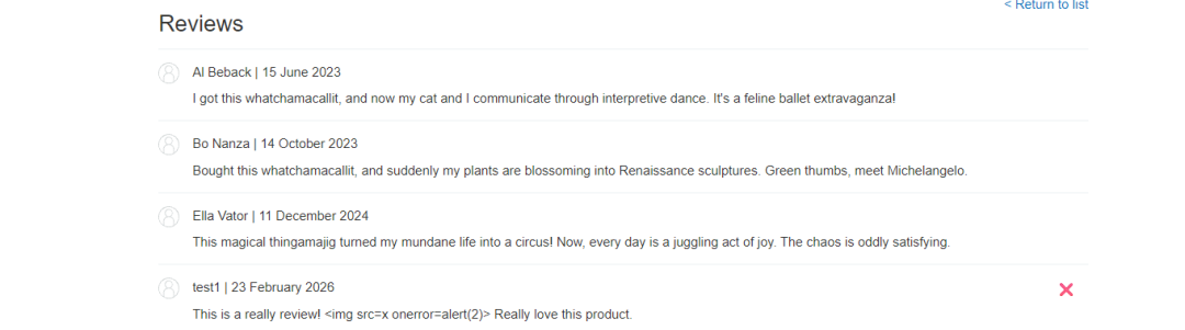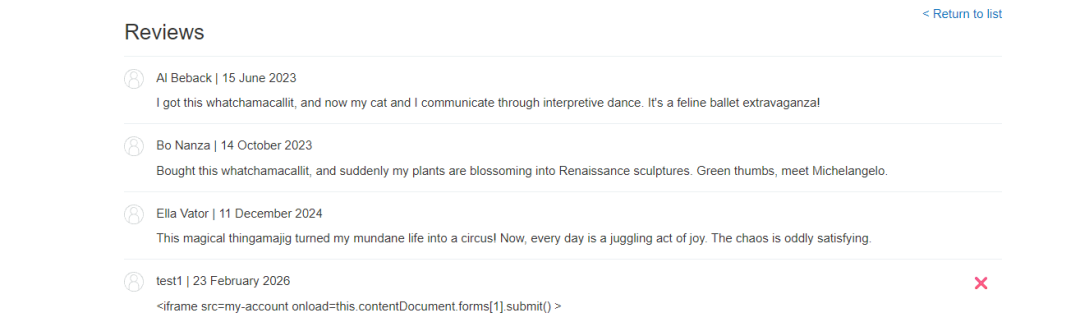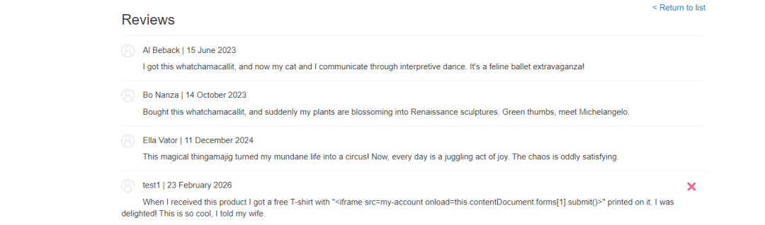 随后我们回到之前的商品评论页面并删除原先的评论载荷并构造以下最小化的恶意载荷内容,此时任意用户访问此页面将会删除对应的账户信息