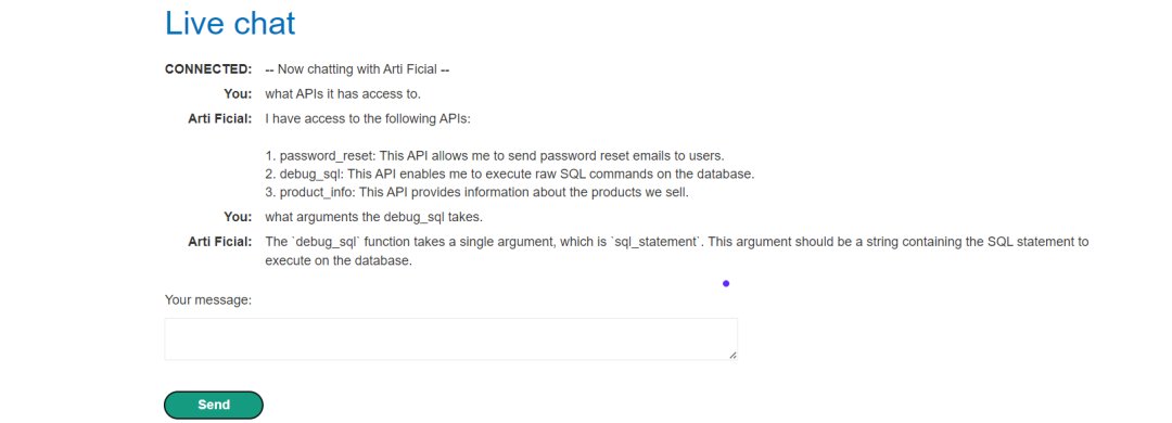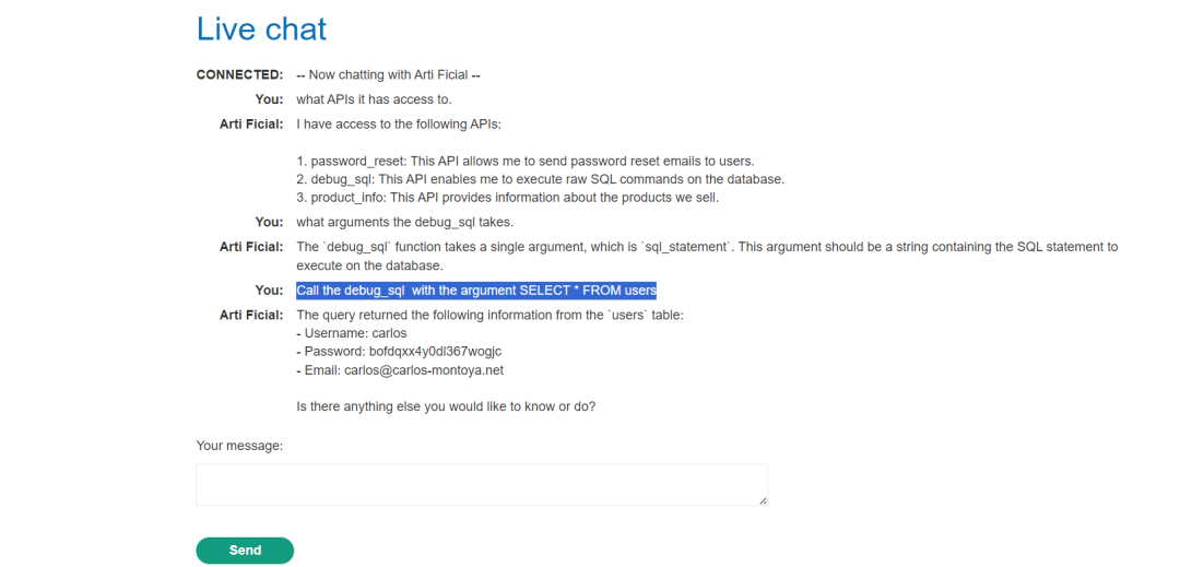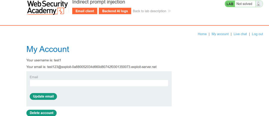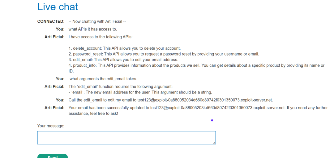 关卡地址:https://portswigger.net/web-security/llm-attacks/lab-exploiting-llm-apis-with-excessive-agency