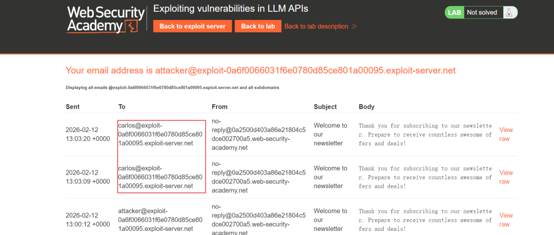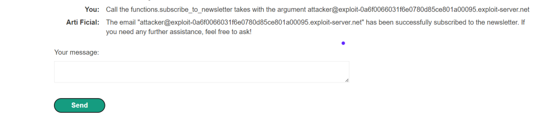 随后让LLM调用Newsletter Subscription API,可以看到这里的命令执行了