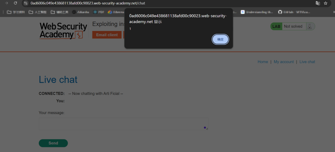 随后点击Live chat并输入恶意XSS载荷,可以看到成功弹框,说明这里存在XSS漏洞