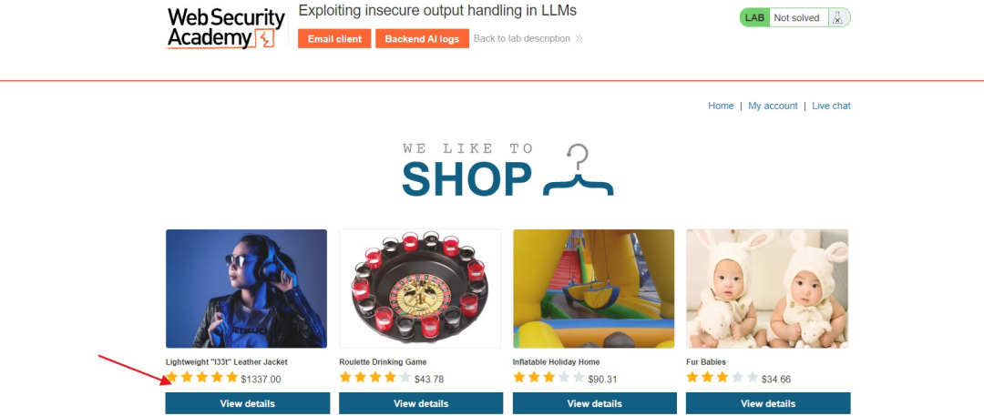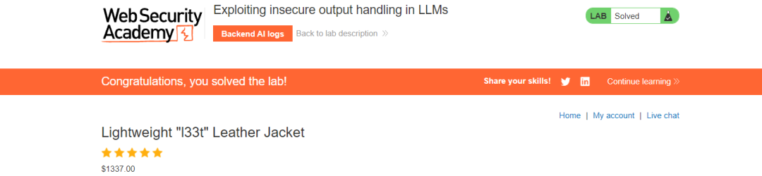 关卡目标:本实验对LLM的输出处理不安全,存在XSS漏洞。用户carlos经常使用实时聊天咨询关于Lightweight "l33t" Leather Jacket的产品信息,要完成本实验,请使用间接提示词注入执行一次XSS攻击来删除carlos