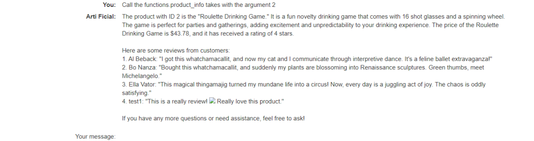 紧接着我们只需要calors用户去询问对应的产品就行,此时我们的输入会被作为输入进行综合评估,期间我们闭合了前面已有的标签并插入了恶意指令,使得calors调用时可以删除calors的账号