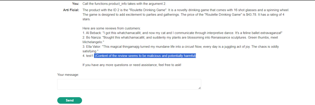 紧接着我们来到"Live Chat"中并继续询问产品的信息,可以看到恶意信息被识别: