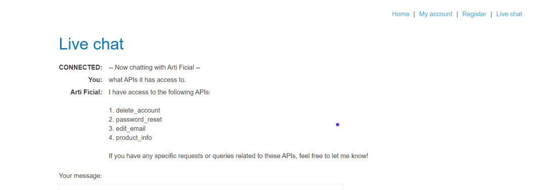 随后再次在Live chat中询问,可以看到LLM的回复中包含了一个小的iframe,这说明载荷已成功执行