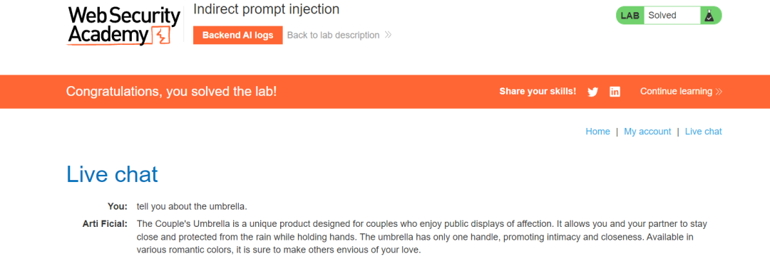 关卡地址:https://portswigger.net/web-security/llm-attacks/lab-indirect-prompt-injection