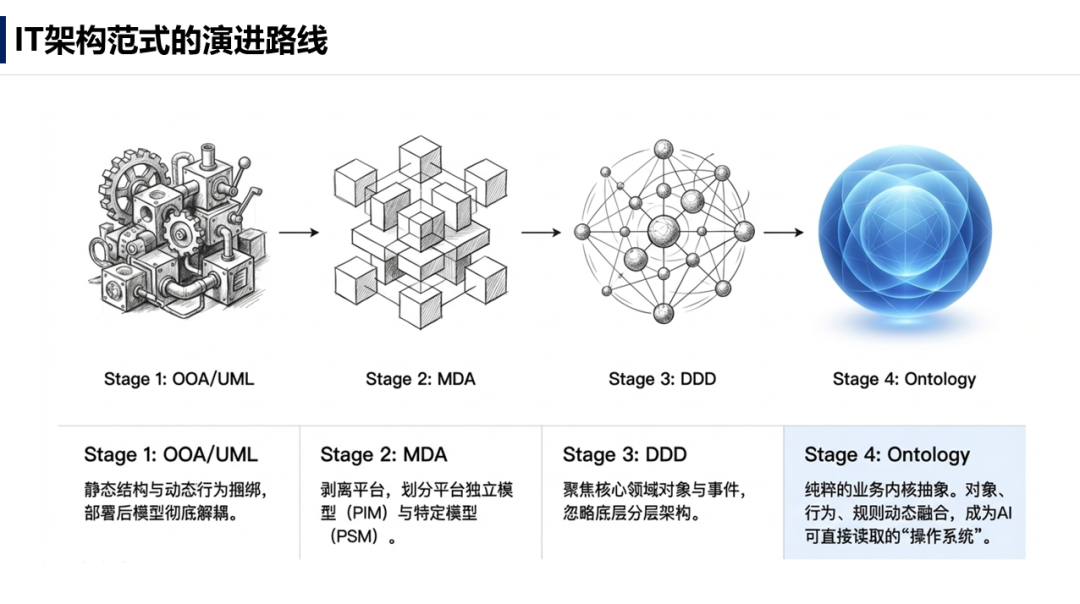 所以我们才会提出一个很核心的内容就叫IT架构范式的演进,从最早的面向对象分析建模到 MDA到 DDD领域建模,再到当前我们提出的基于本体模型加 AI 大模型驱动的新的 AI 原生架构的构建模式。
