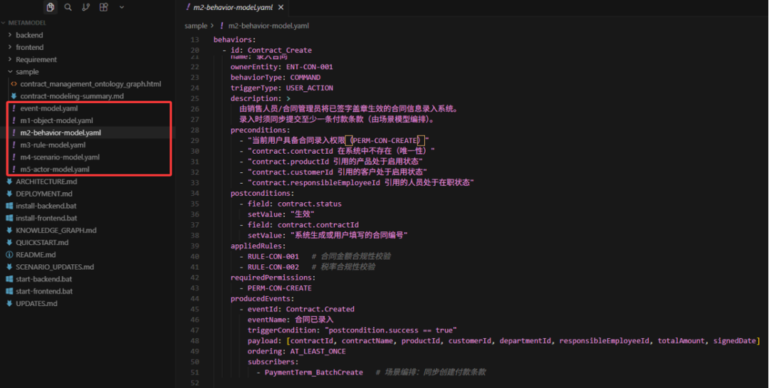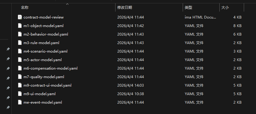 这套建模文件实际在我构建的早期只有对象,行为,规则,场景四大模型。到后期扩展了事件模型,主体模型,异常补偿模型,实现了基于EDA驱动架构的消息解耦和事件回写。同时再后来又增加了UI建模的Yaml文件和技术架构的Yaml文件,方便实现基于本体模型一键生成完整的AI原生应用系统。