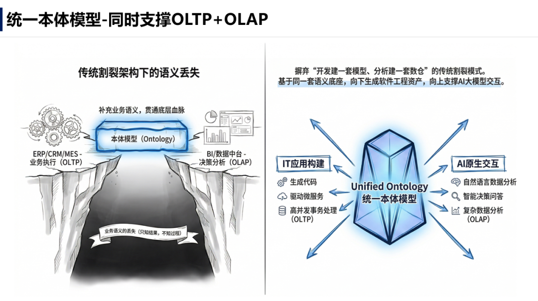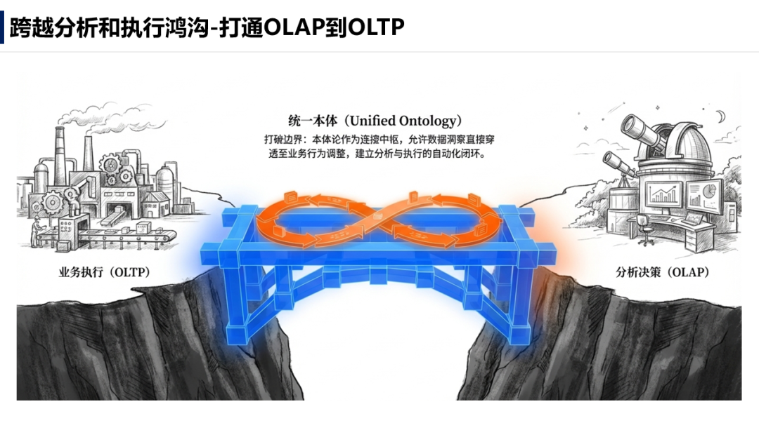 因此进行本体建模,构建对象行为规则的融合模型。在存量系统和IT环境下,其核心作用就是要打通 OLTP 到 OLAP 的鸿沟,通过统一本体论本体模型作为一个关键的核心的连接中枢,允许数据洞察直接穿透到业务行为,建立分析与执行的闭环。