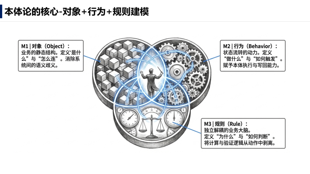 打通端到端的业务流,包括我原来也讲过本体论的核心。其实就三个对象建模行为建模规则建模对象里面不仅仅是数据模型,当然也包括了数据之间的关系行为建模。也就是要说清楚数据形成的原因,包括数据状态发生变化以后,对后续数据对象行为的影响。是关键的行为语义的补充。